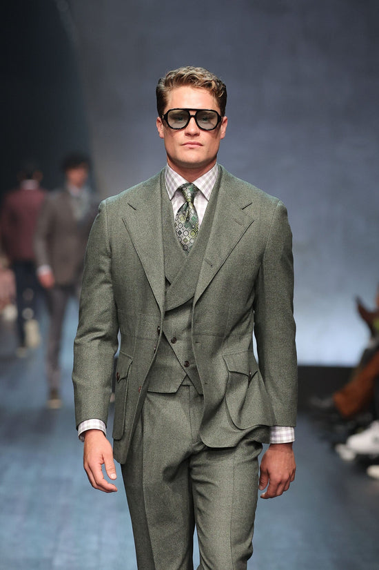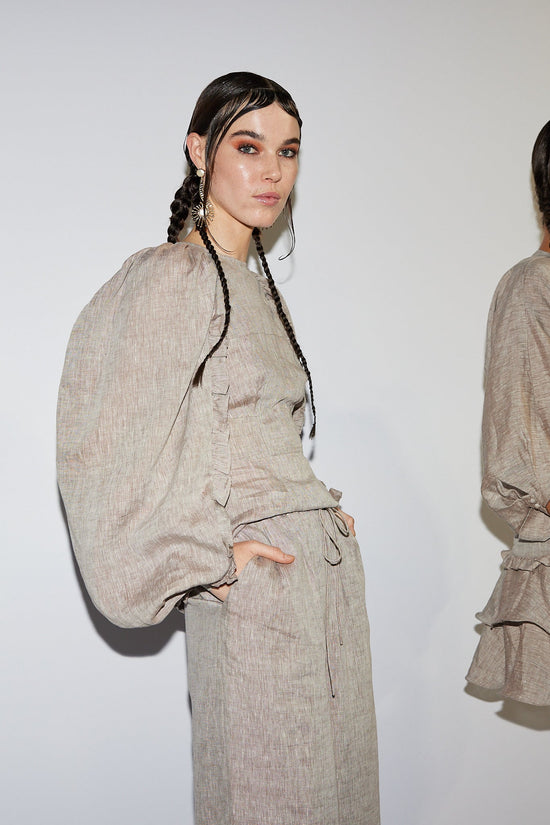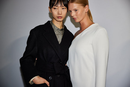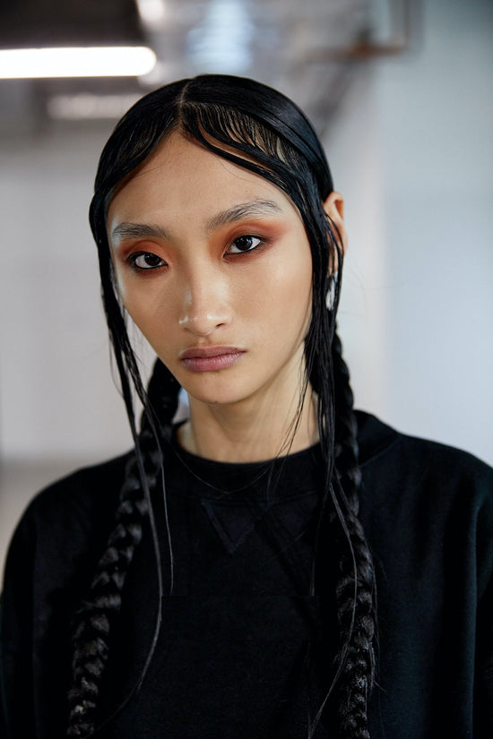 "We created a few slightly different looks for this show, all dependant on what the models had naturally going on. We created a lot of dry texture that worked with the models' natural style. We created a centre part and kept hair flat, close to the head with hair being smoothed behind the ears and either flowed freely at the back, tucked into their collars and coats or slicked and pulled back into a bun." JS